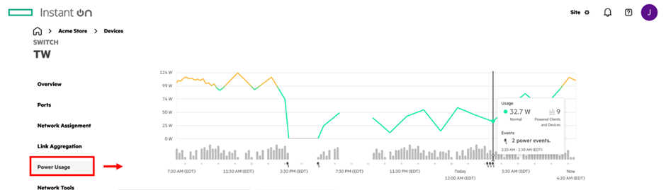 Accessing the PoE Dashboard is straightforward: log in to your Instant On Cloud Portal, navigate to the “Power Usage” section of your PoE device. This can be any PoE-capable Switch, AP22D, and SG2505P. From the “Power Usage” screen, you can select the port or device you wish to manage. The PoE Dashboard tab is prominently placed, ensuring you’re only a click away from granular power insights.